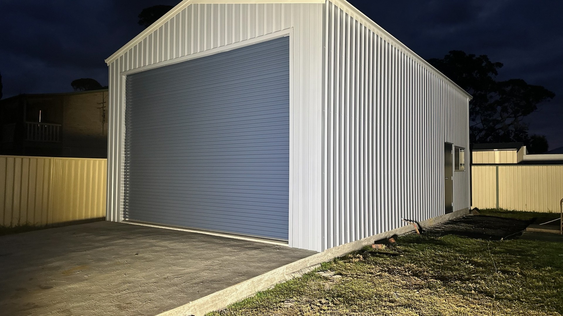 A double-size garage with extra height to accommodate future storage with a mezzanine floor is needed. Combination of Colorbond Bluegum, Shale Grey and Deep Ocean, monoclad wall cladding, with roller door motors and roof insulation for a bit of comfort.
