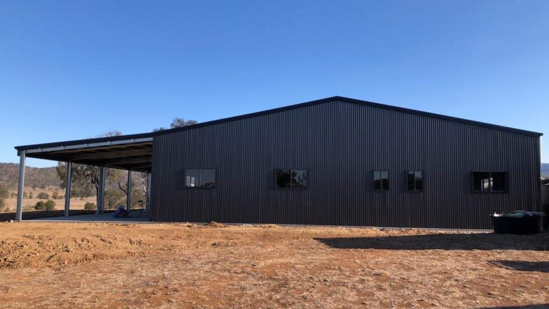 14m x 15m x 3.5m wall height, with a 14x6m lean to in COLORBOND® Monument® Monoclad wall cladding and surfmist® corrugated roof sheeting.