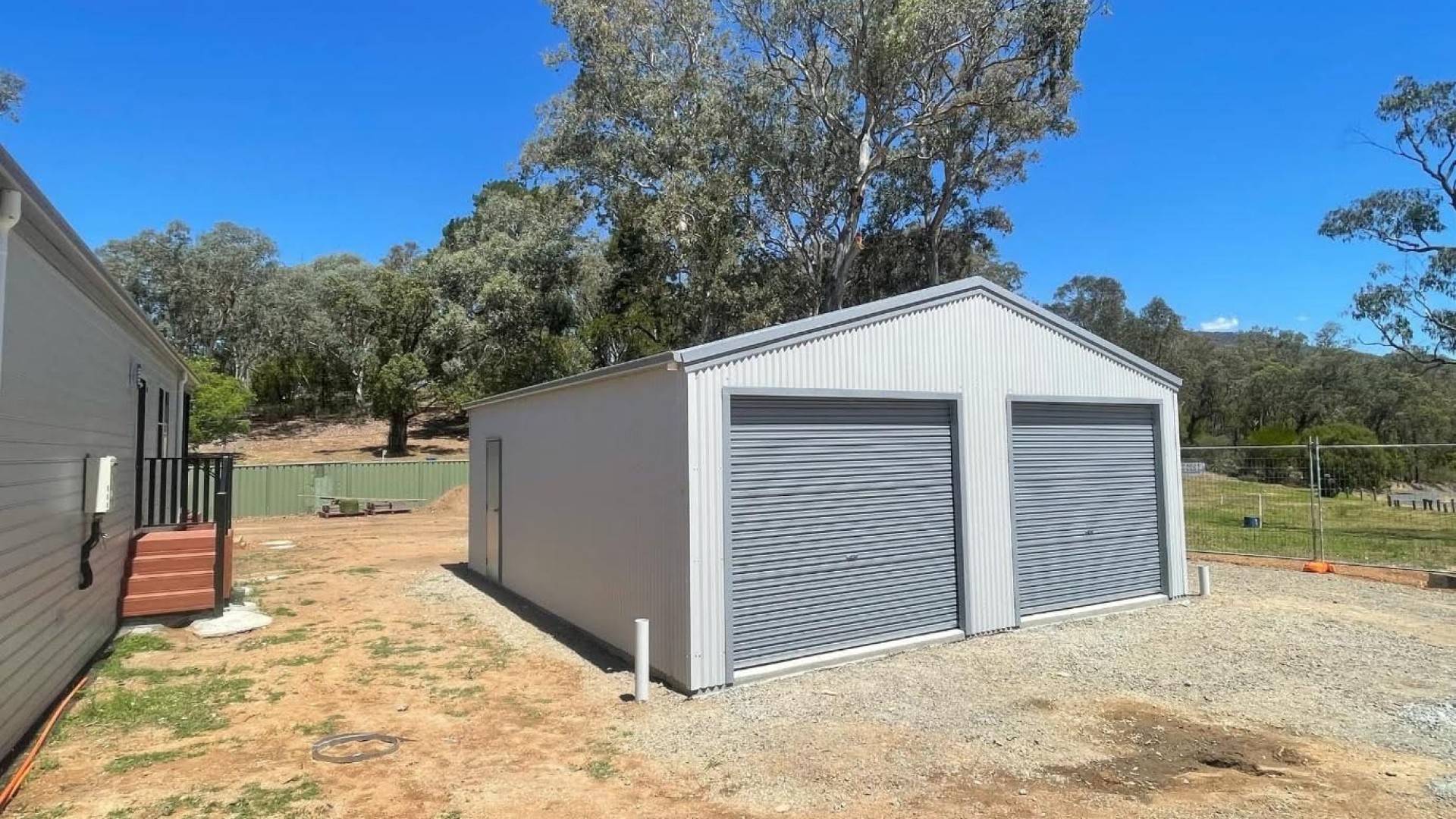 Double size garage with 2x roller doors for easy access. A combination of Colorbond Southerly and Bluegum, corrugrated wall cladding, with roller door motors and roof insulation for extra comfort.