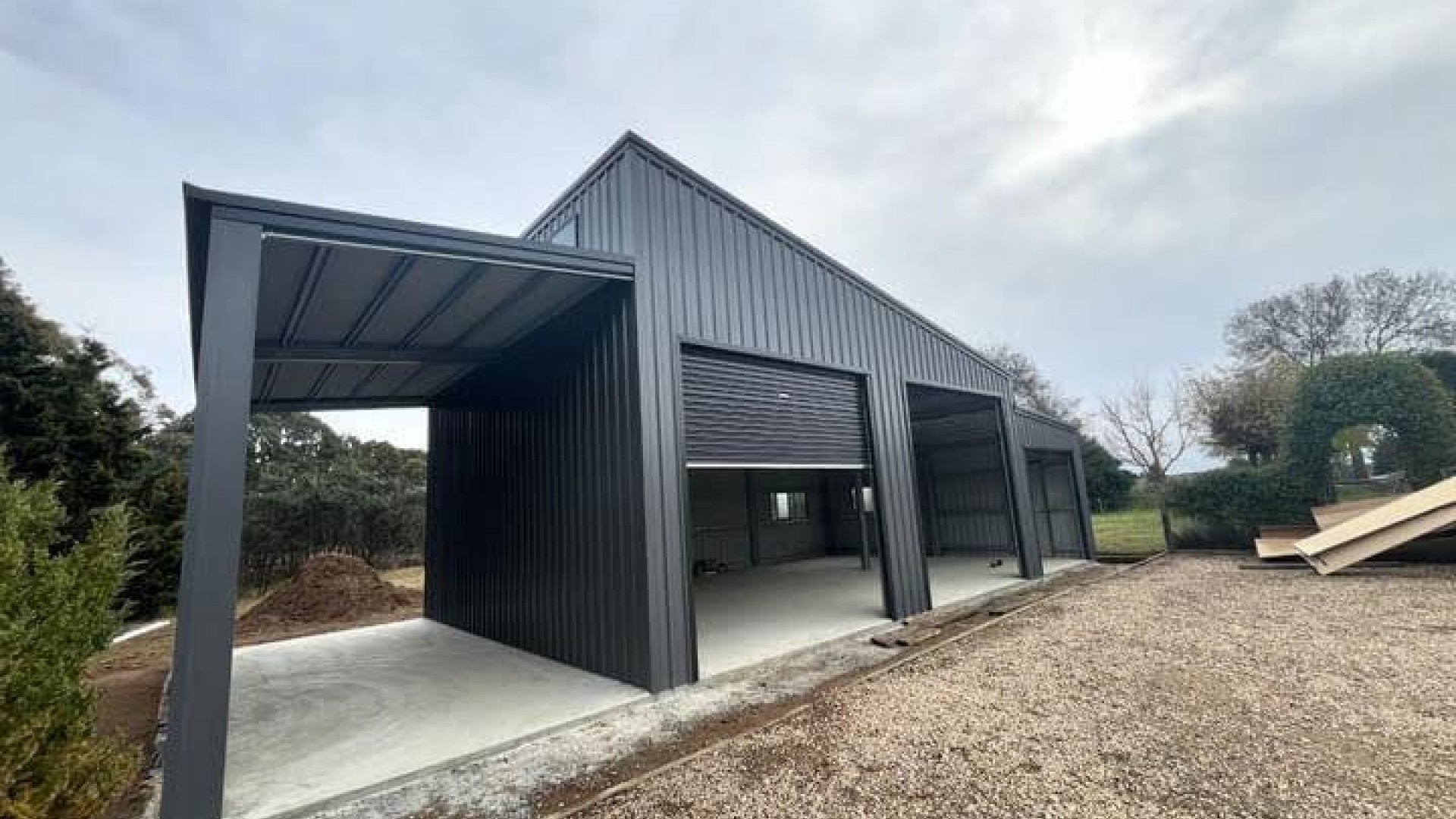 15m wide x 7m long (including lean-tos) 3.6m high (gutter height) Colorbond Shale Grey Corrugated Roof with Monoclad wall cladding in Basalt and Monument doors and trim.